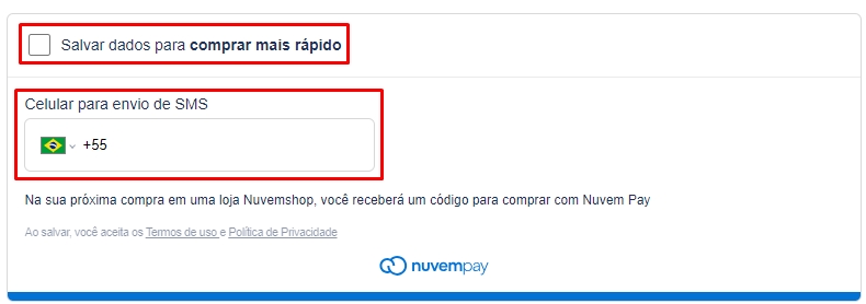3. Ao chegar na última etapa, escolha uma forma de pagamento e marque a opção "Salvar dados para compra mais rápido" e fornecer um número de telefone celular.