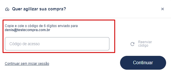 5. Quando você acessar novamente a loja para realizar outra compra, na página de finalização, o basta digitar o seu e-mail que o irá reconhecer os seus dados e solicitará uma verificação via código SMS.